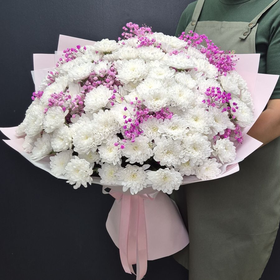 Цветочный состав: хризантемы микс, эустомы, диантусы, озотамнус, статица.