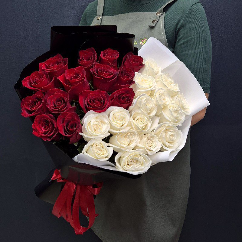 Этот выразительный букет построен на классическом сочетании страстного алого и безупречно белого цветов. Такое сочетание символизирует единство противоположностей, гармонию и чистоту чувств. Идеальный выбор для тех, кто хочет сделать яркое и запоминающееся признание.