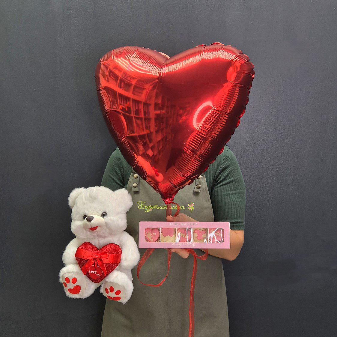 Этот подарочный набор — настоящая концентрация нежности и внимания. Он создан для того, чтобы вызвать искреннюю улыбку и создать атмосферу праздника, даже не используя слова. Сочетание мягкой игрушки, сладостей и яркого декора делает его идеальным сюрпризом на 14 февраля.