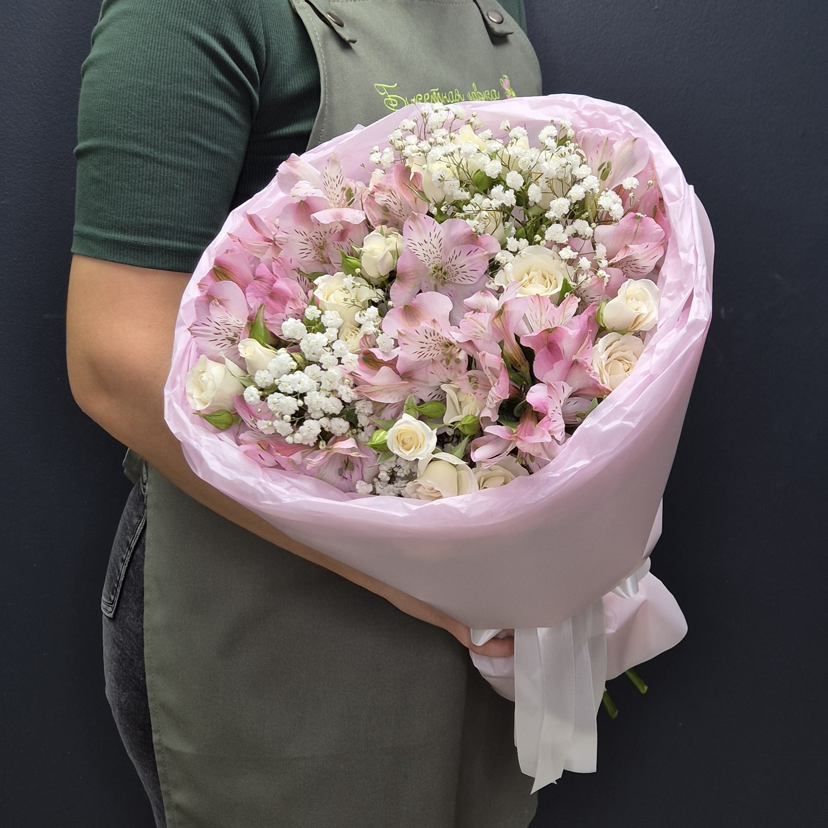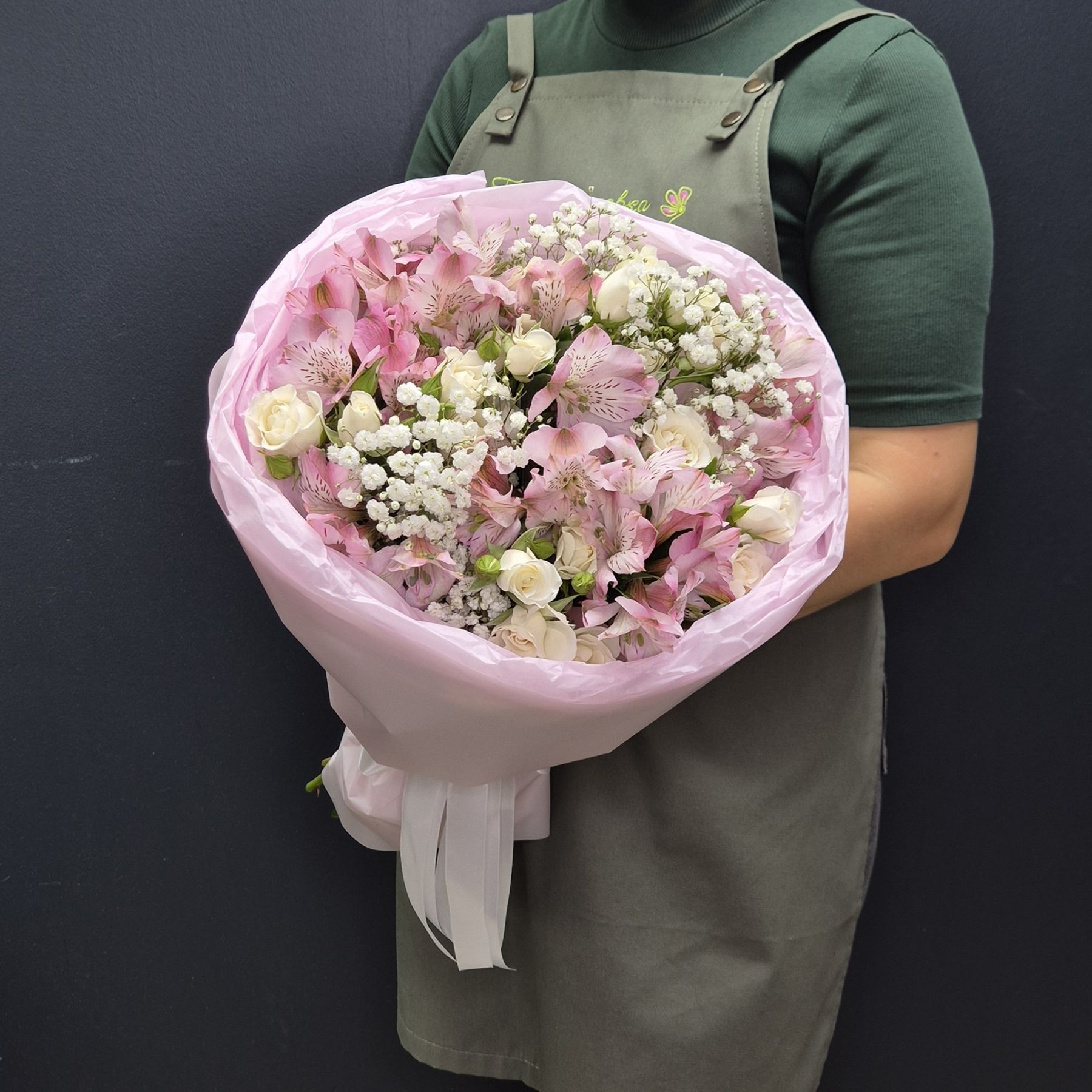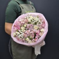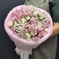 Состав: 1. Роза кустовая - 10 шт 2. Альстромерия - 7 шт 3. Гипсофила - 3 шт 4. Тишью - 2 шт 5. Упаковка - 1 шт 6. Лента - 1 шт