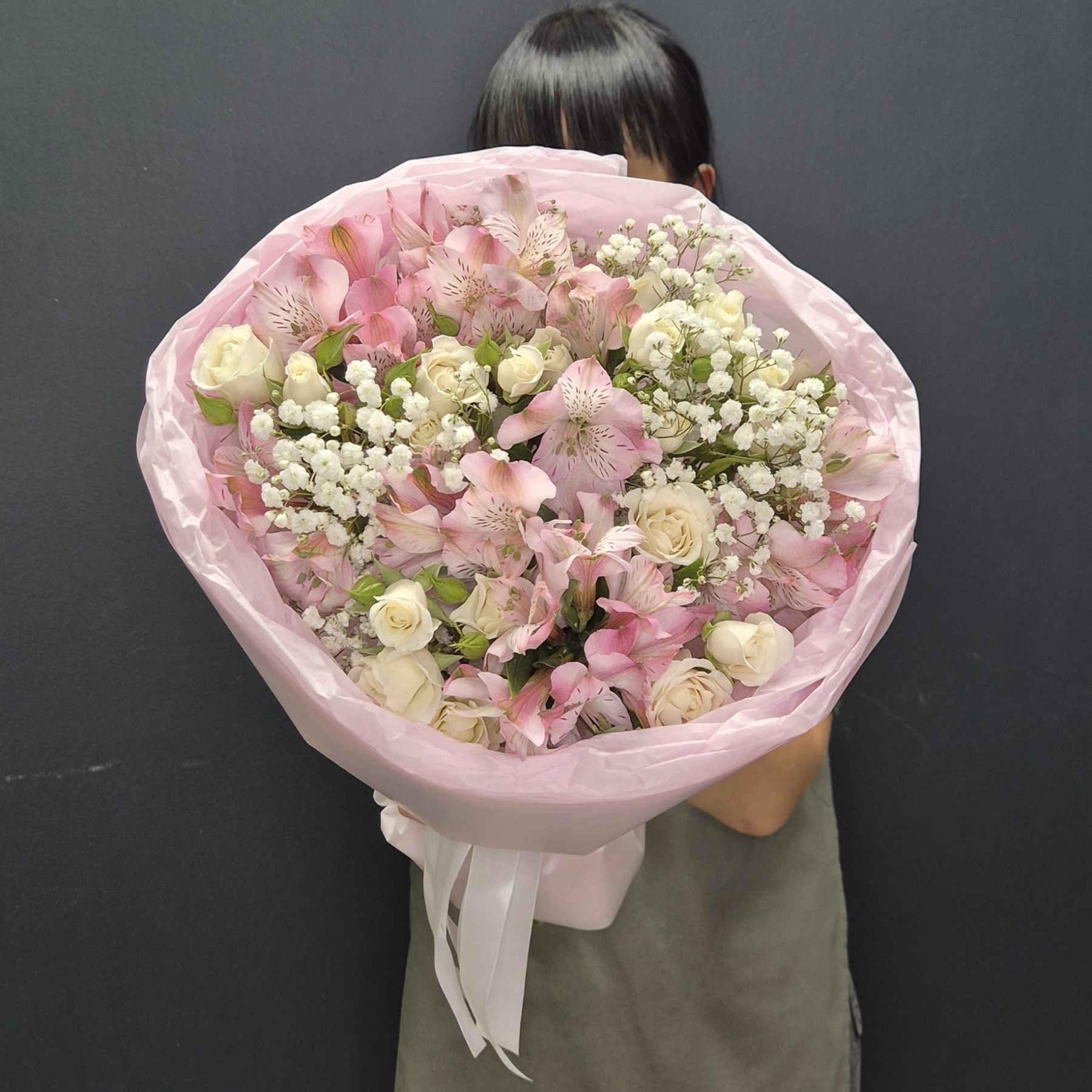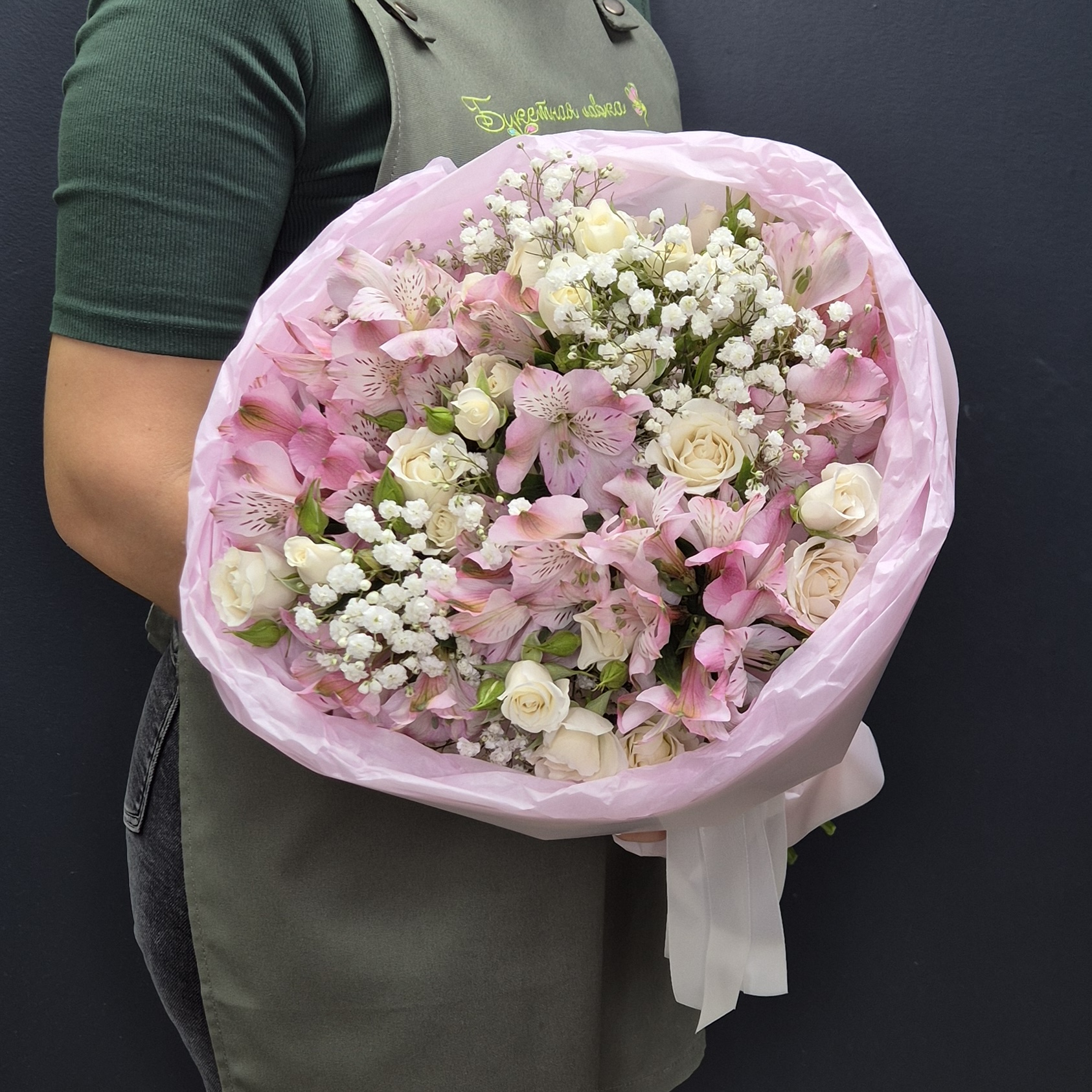 Состав: 1. Роза кустовая - 10 шт 2. Альстромерия - 7 шт 3. Гипсофила - 3 шт 4. Тишью - 2 шт 5. Упаковка - 1 шт 6. Лента - 1 шт