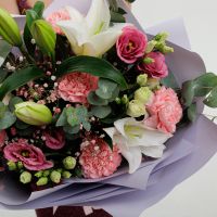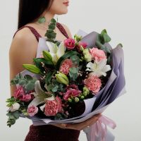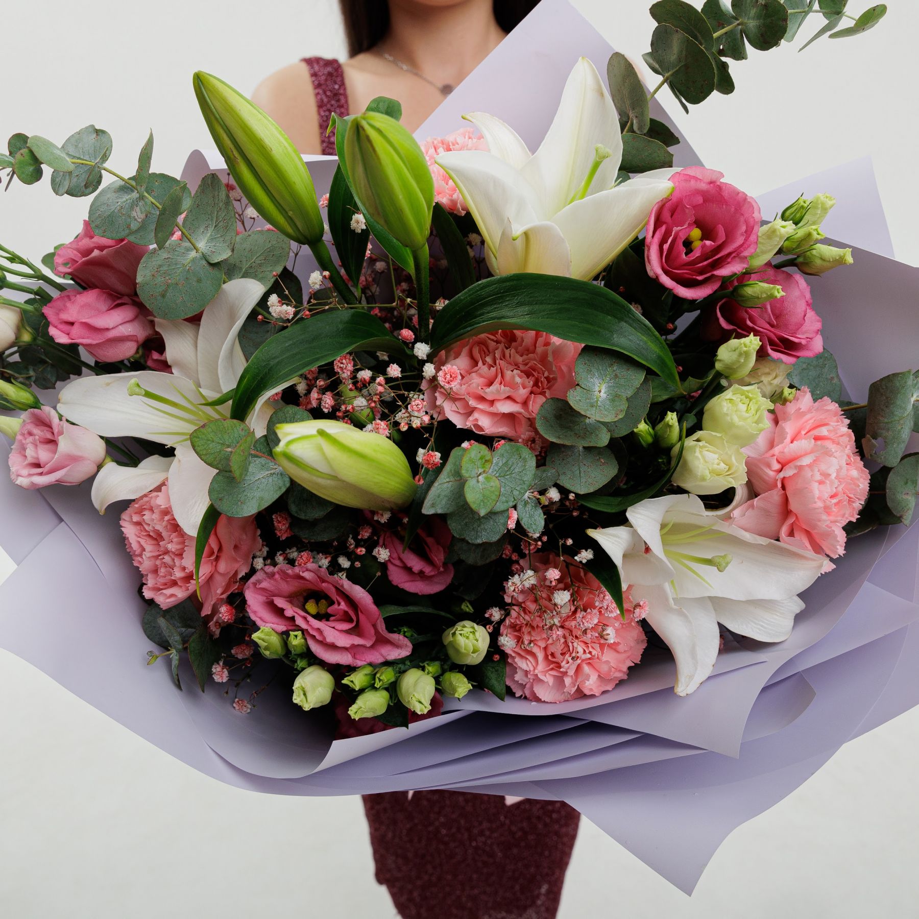 Сборный букет с лилией, диантусами, эустомой и гипсофилой - прекрасный выбор!