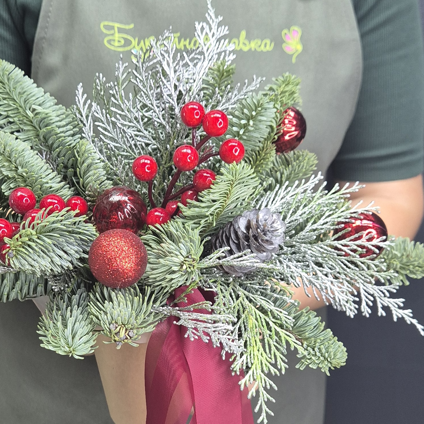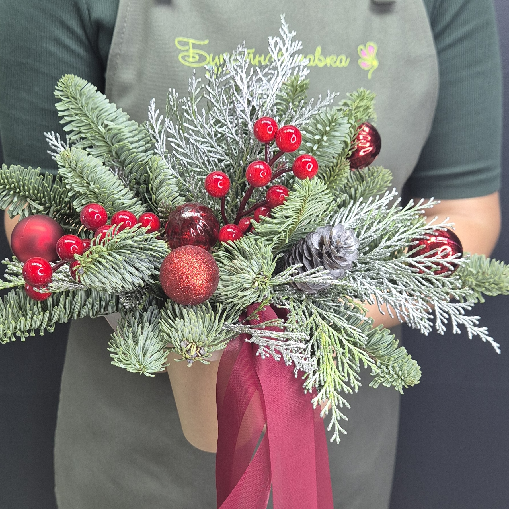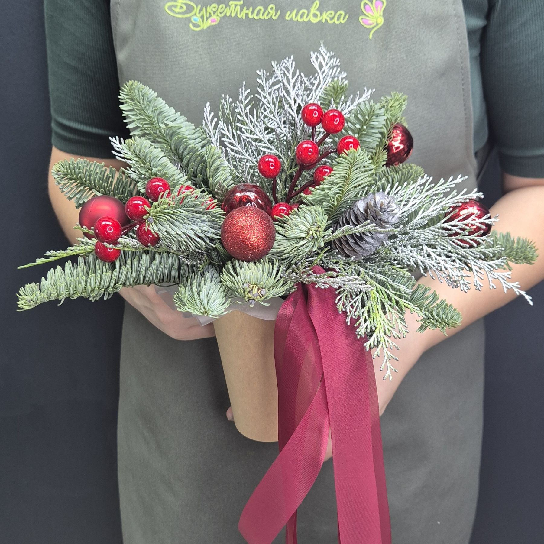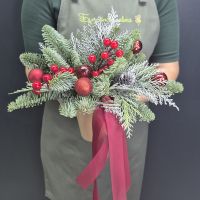 Состав: 1. Стаканчик крафт - 1 шт 2. Оазис - 1 шт 3. Упаковка - 1 шт 4. Нобилис - 0.5 шт 5. Шар ёлочный - 5 шт 6. Туя - 0.5 шт 7. Ягода декоративная - 2 шт 8. Шишка - 1 шт