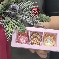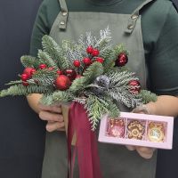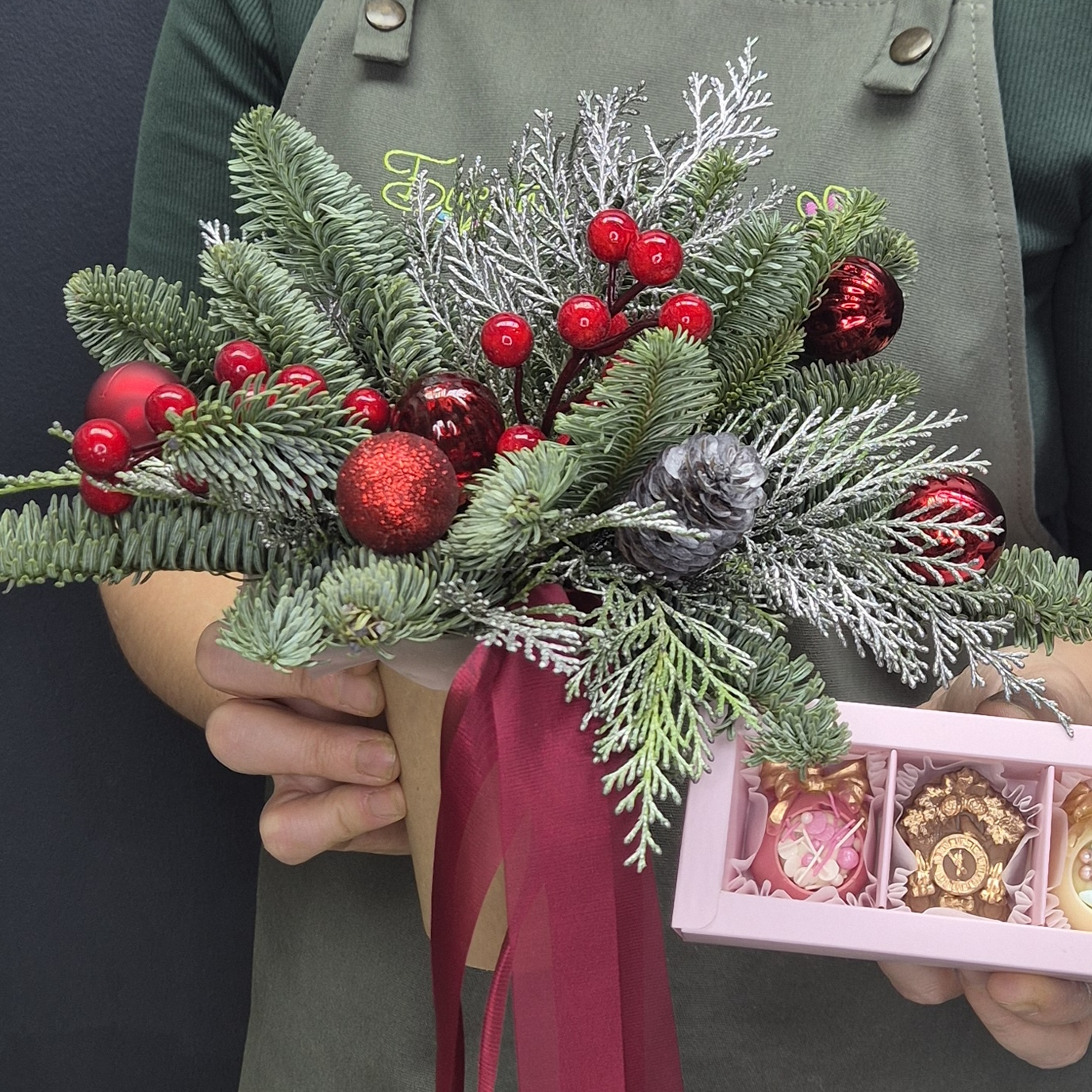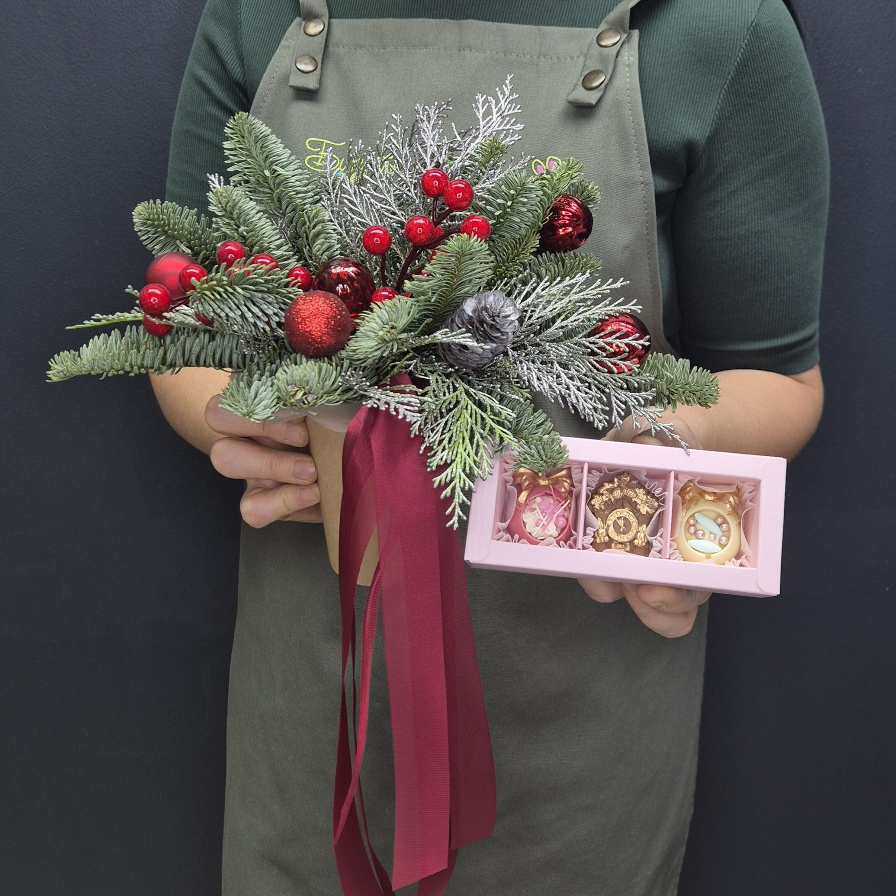 Состав: 1. Стаканчик крафт - 1 шт 2. Оазис - 1 шт 3. Упаковка - 1 шт 4. Нобилис - 0.5 шт 5. Шар ёлочный - 5 шт 6. Туя - 0.5 шт 7. Ягода декоративная - 2 шт 8. Шишка - 1 шт 9. Шоколад - 1 шт