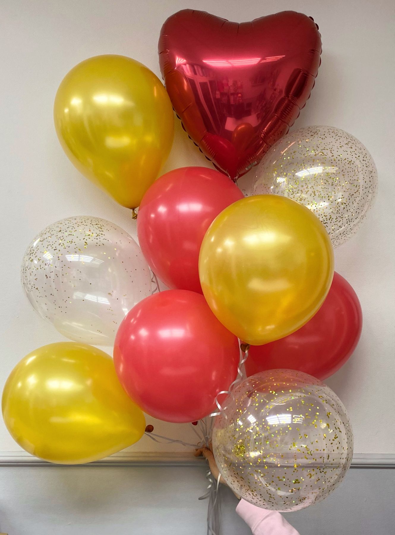 В составе связки: 6 однотонных шаров, 3 шара с конфетти и 1 фольгированное сердце