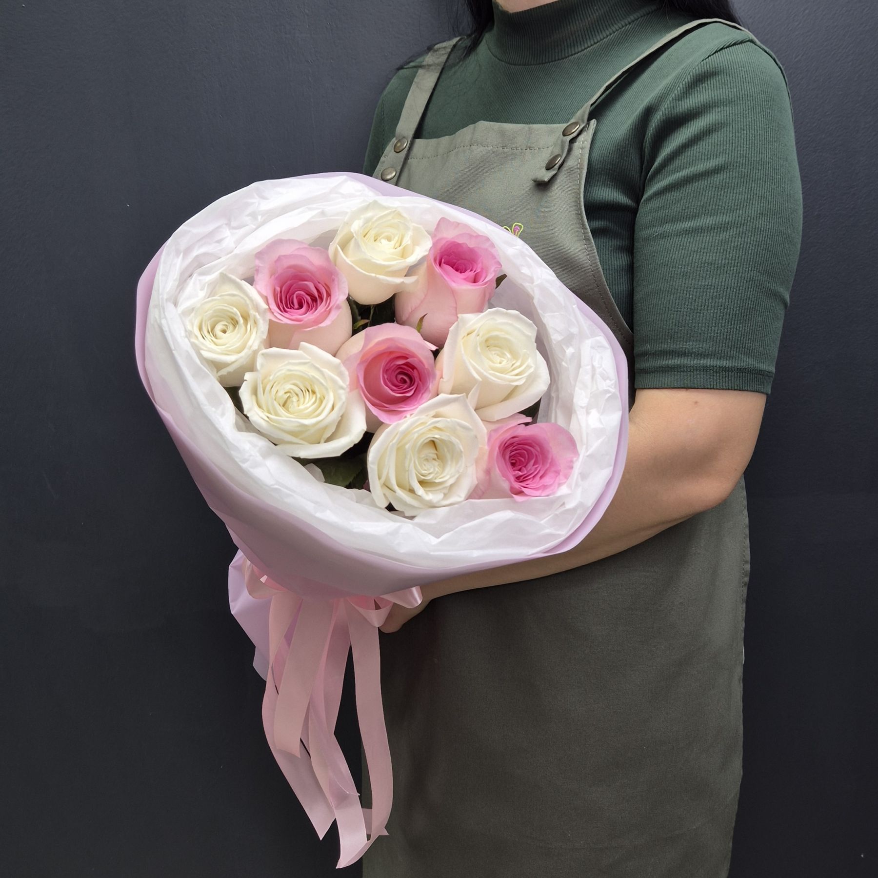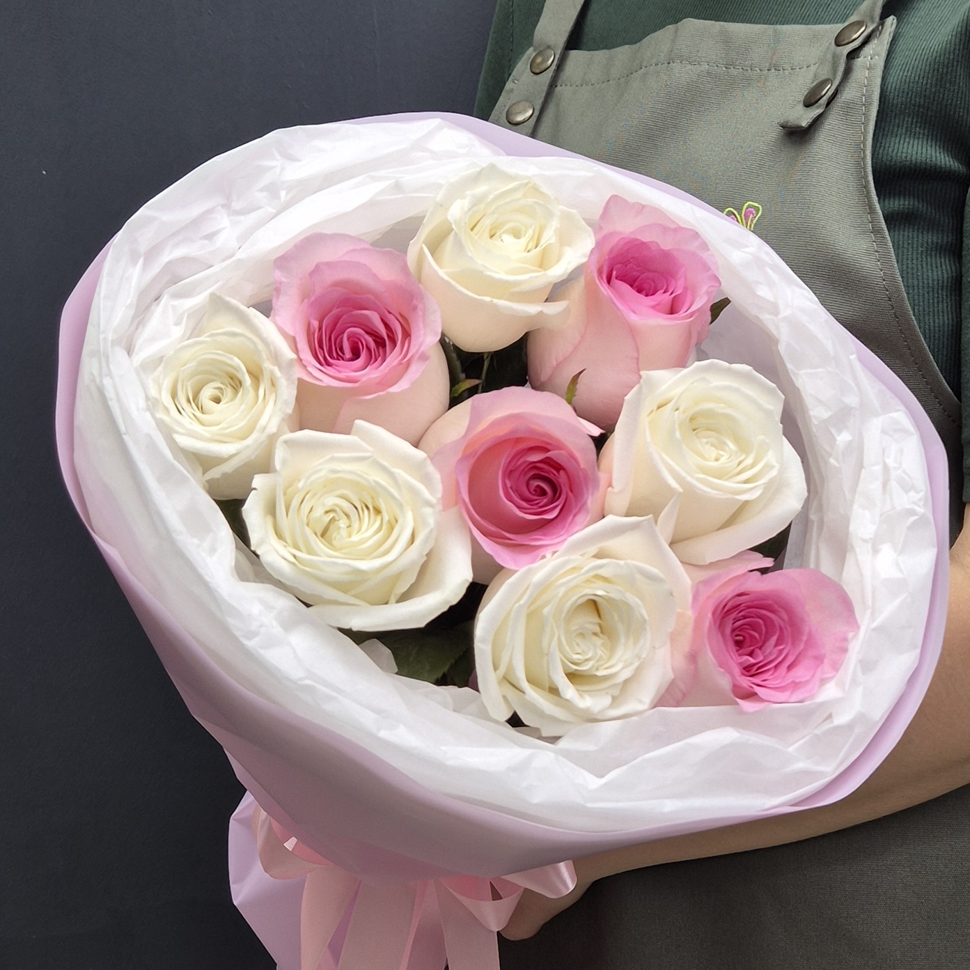 Этот букет — само воплощение нежности и изящества. Сочетание классических белых роз и роз с мягким розовым градиентом создает гармоничный и легкий образ, напоминающий воздушный десерт.