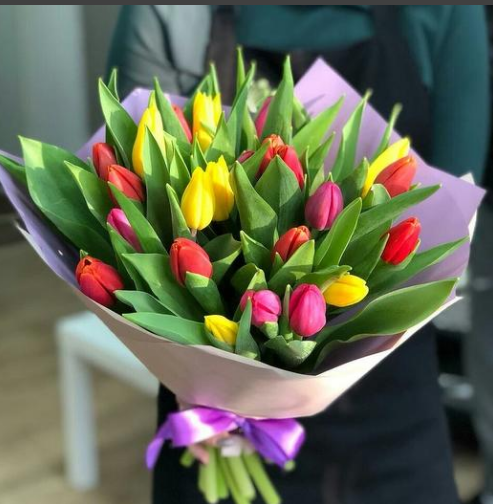 Красочный букет в составе 21 тюльпан микс Голандия в упаковке с атласной лентой.